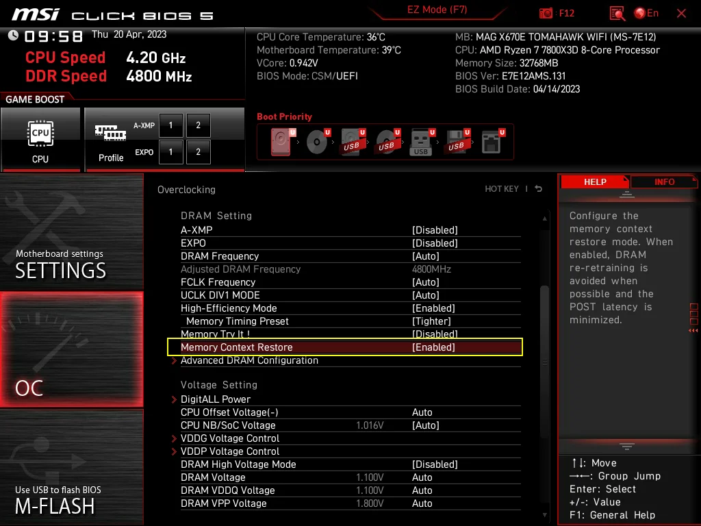 Trong BIOS, bạn có bật cái tùy chọn nào tên là Memory Context Restore chưa? Cái này chắc sẽ giảm thiểu việc train bộ nhớ DDR5 và làm cho PC khởi động nhanh hơn đó.